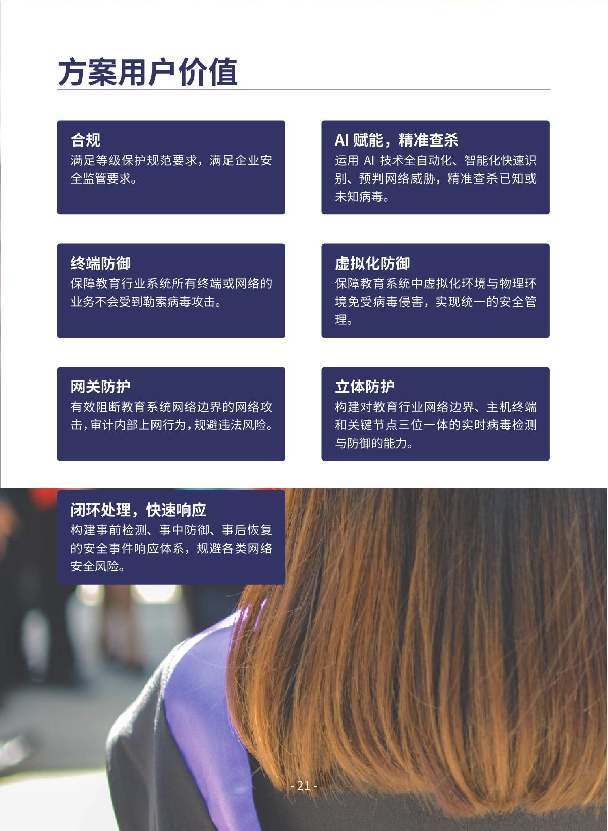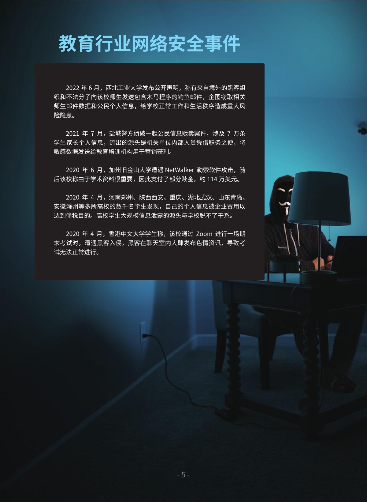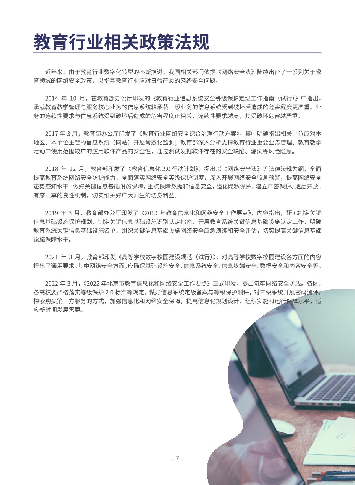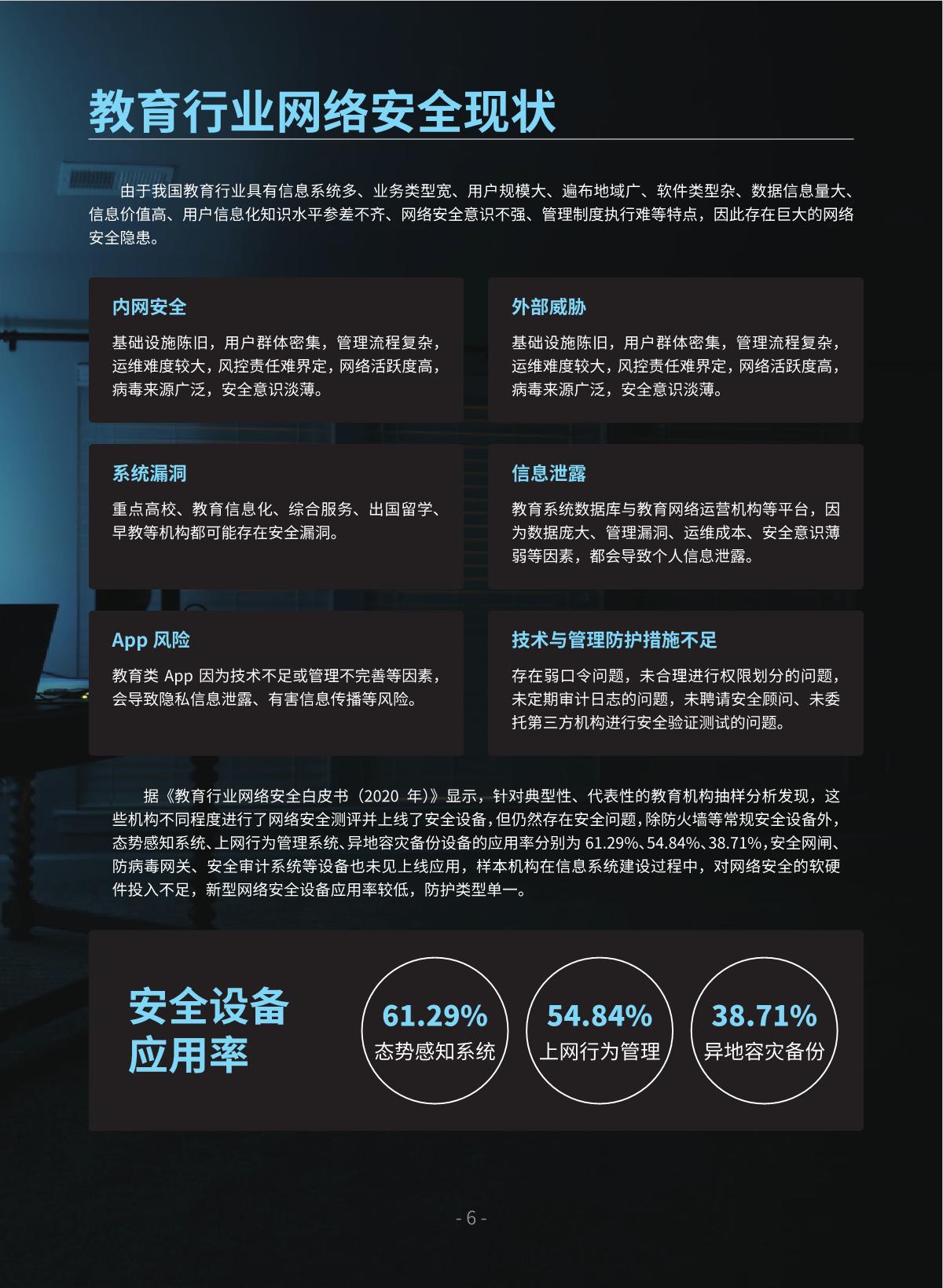 由于我国教育行业具有信息系统多、业务类型宽、用户规模大、遍布地域广、软件类型杂、数据信息量大、 信息价值高、用户信息化知识水平参差不齐、网络安全意识不强、管理制度执行难等特点,因此存在巨大的网络 安全隐患。