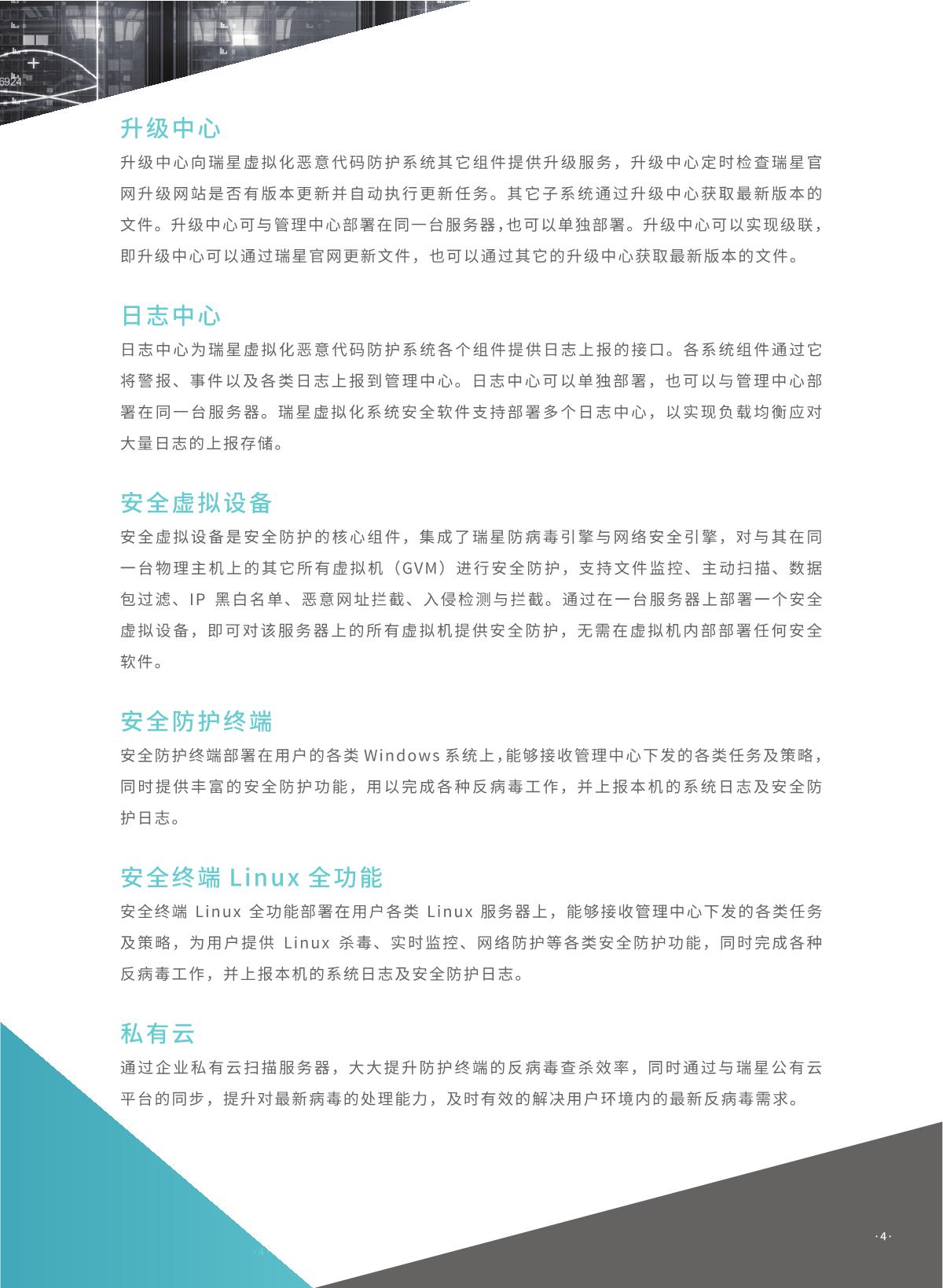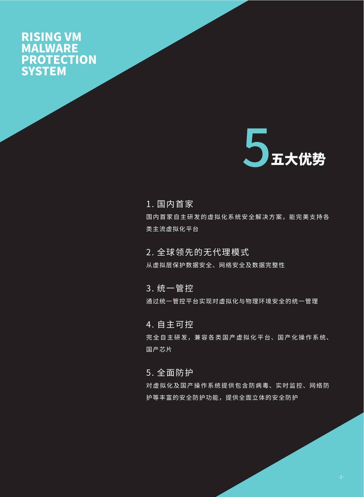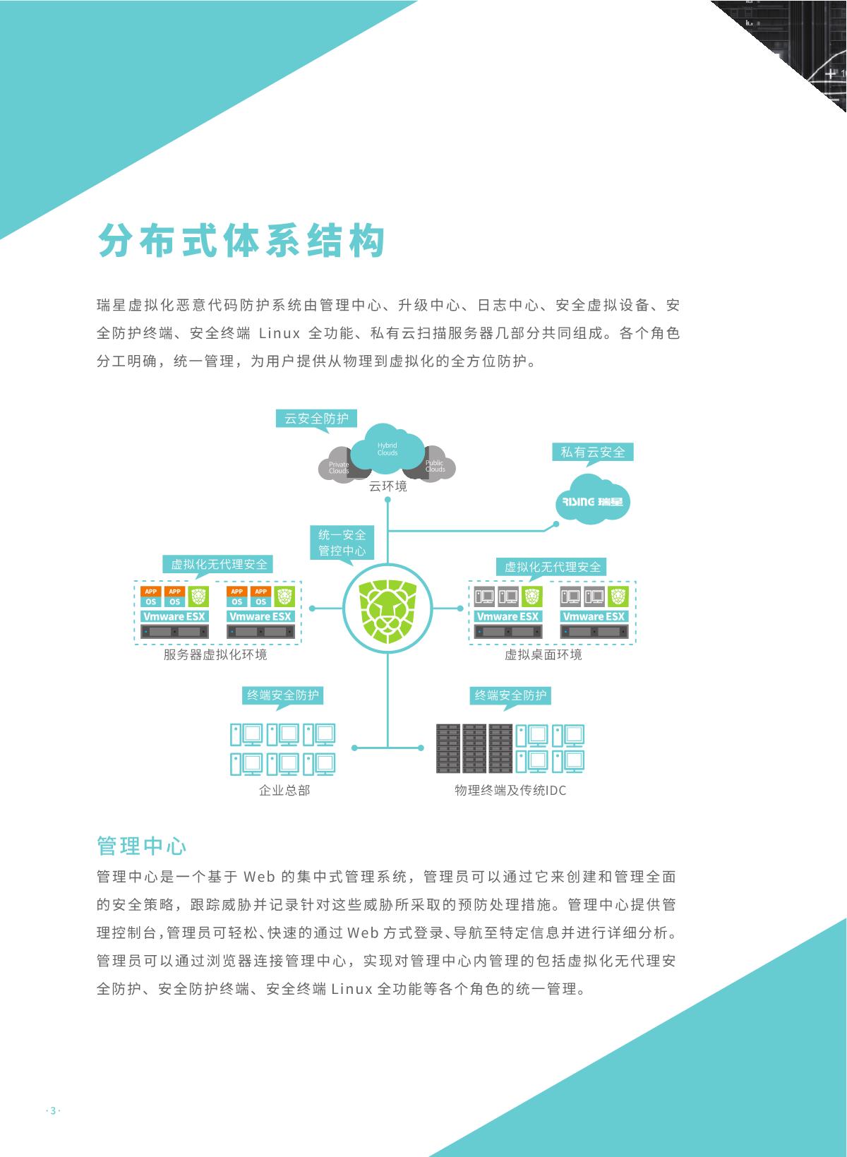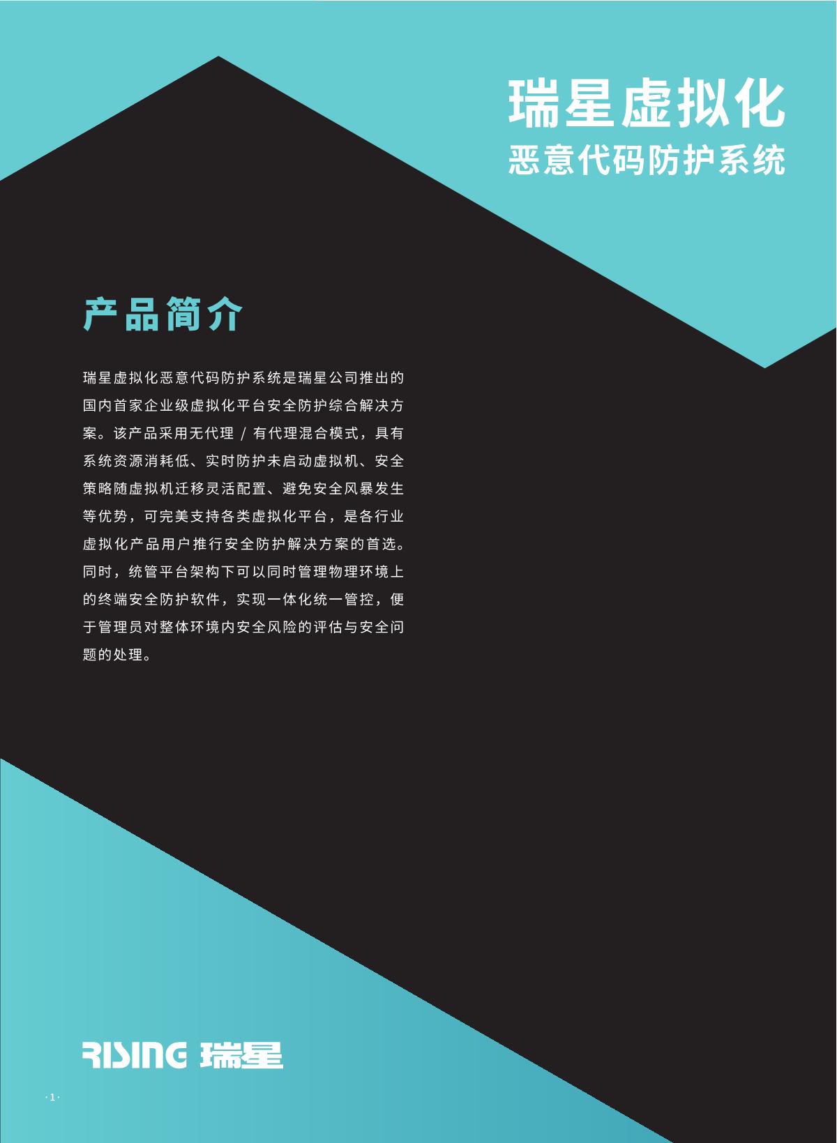 瑞星虚拟化恶意代码防护系统是瑞星公司推出的 国内首家企业级虛拟化平台安全防护综合解決方 案。该产品采用无代理 !有代理混合模式,具有 系统资源消耗低、实时防护未启动虛拟机、安全 策略随虛拟机迁移灵活配置、避免安全风暴发生 等优势,可完美支持各类虛拟化平台,是各行业 虛拟化产品用户推行安全防护解决方案的首选。 同时,统管平台架构下可以同时管理物理环境上 的终勞安全防护软件,实现一体化统一管控,便 于管理员对整体环境内安全风险的评估与安全问 题的处理。