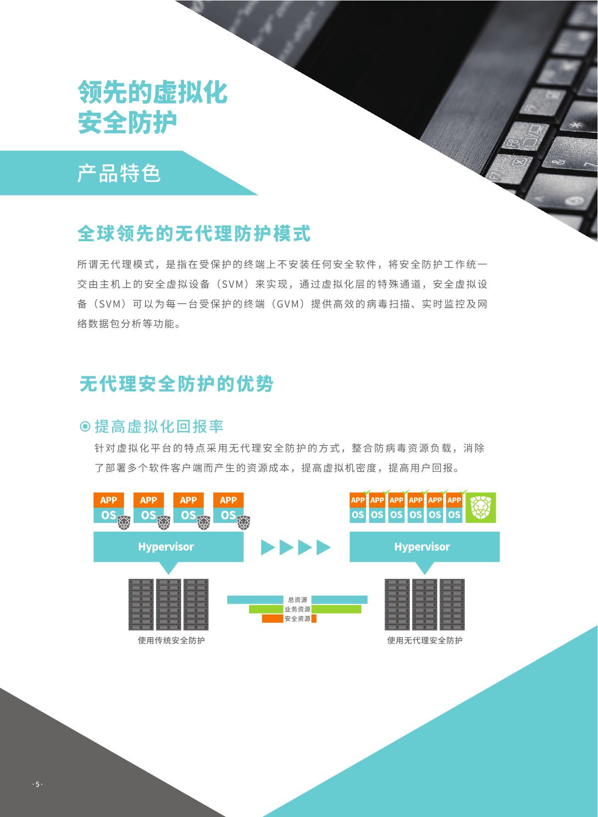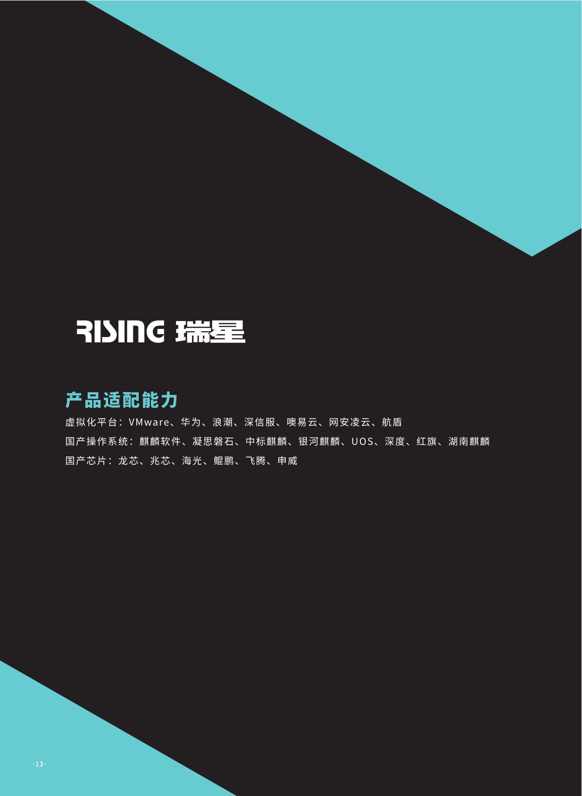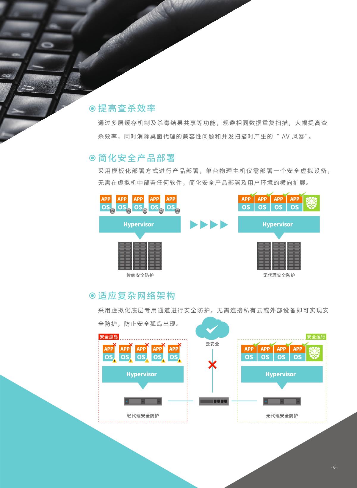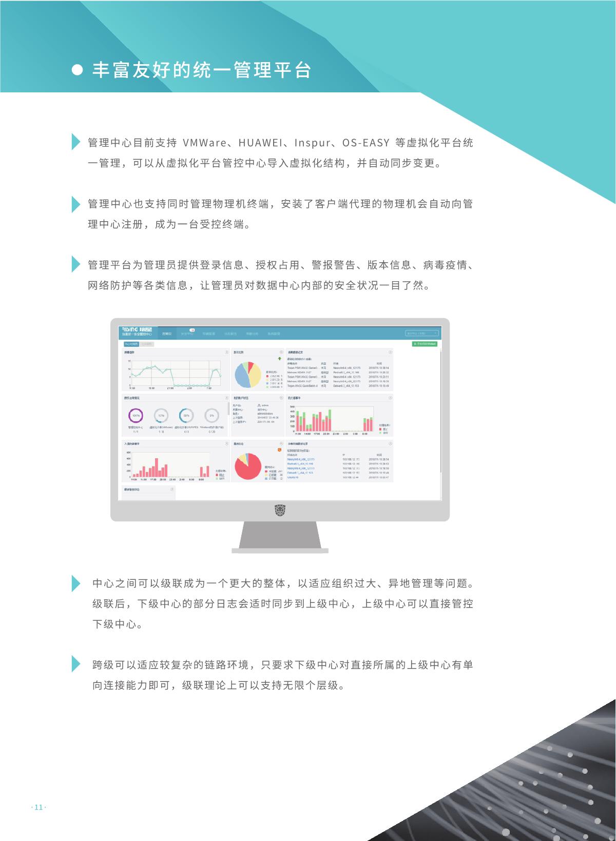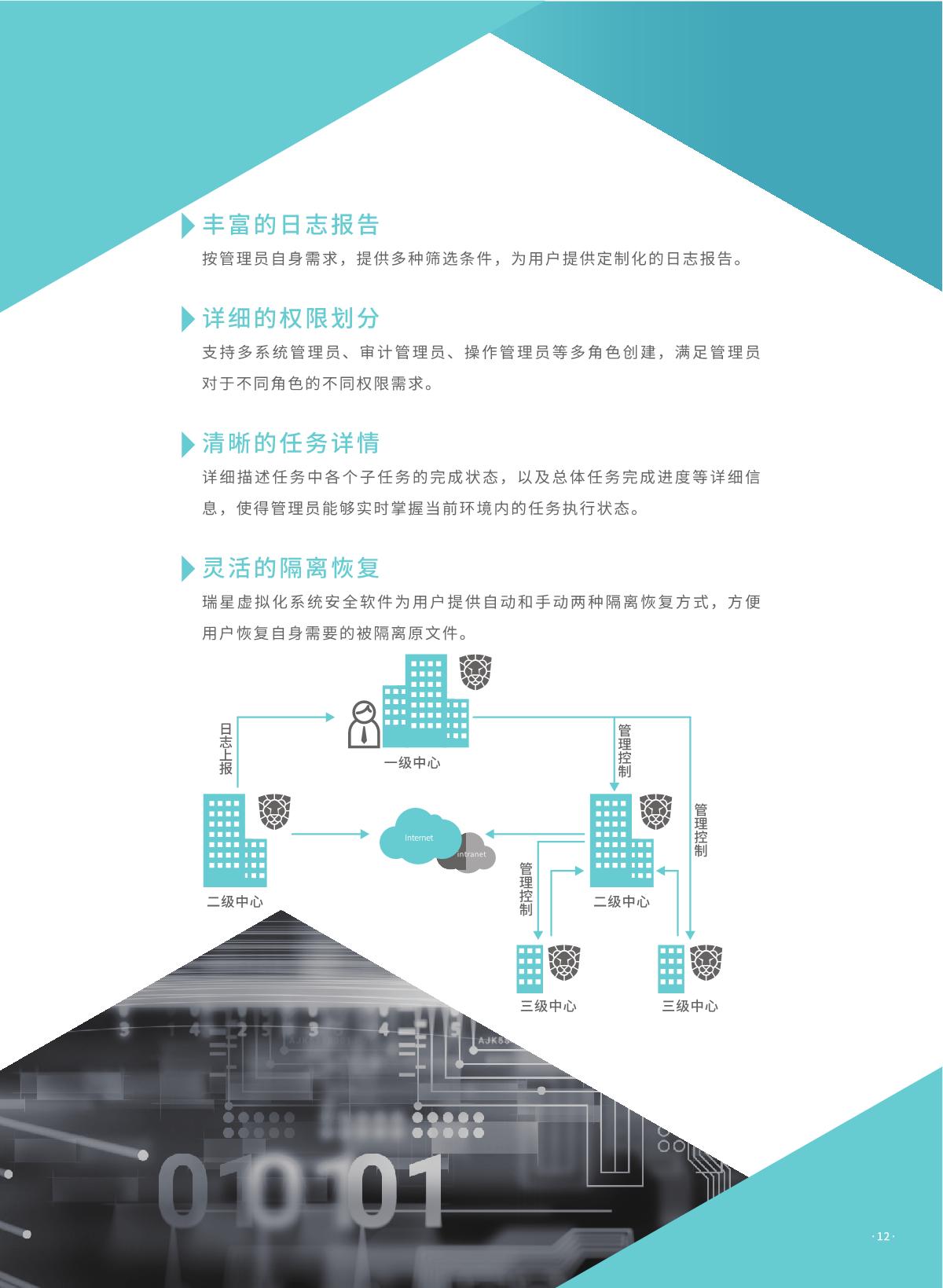 瑞星虚拟化恶意代码防护系统是瑞星公司推出的 国内首家企业级虛拟化平台安全防护综合解決方 案。该产品采用无代理 !有代理混合模式,具有 系统资源消耗低、实时防护未启动虛拟机、安全 策略随虛拟机迁移灵活配置、避免安全风暴发生 等优势,可完美支持各类虛拟化平台,是各行业 虛拟化产品用户推行安全防护解决方案的首选。 同时,统管平台架构下可以同时管理物理环境上 的终勞安全防护软件,实现一体化统一管控,便 于管理员对整体环境内安全风险的评估与安全问 题的处理。