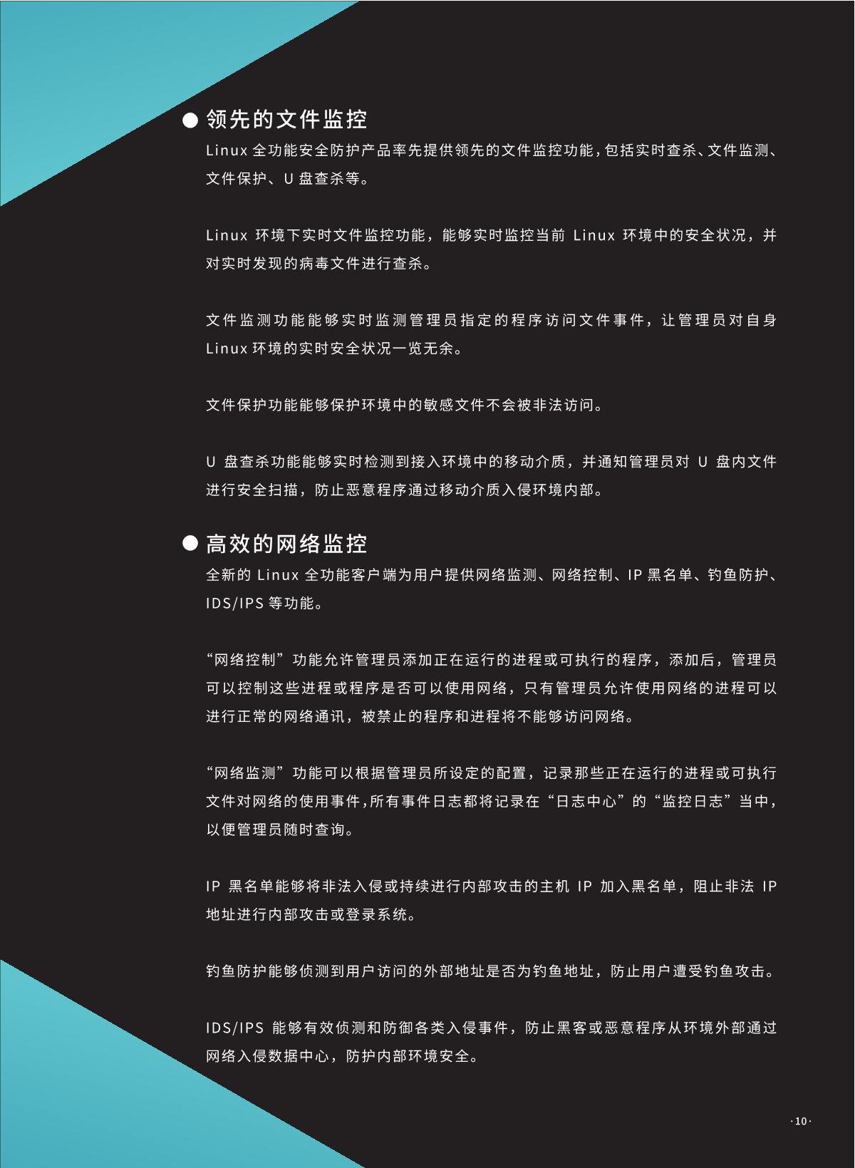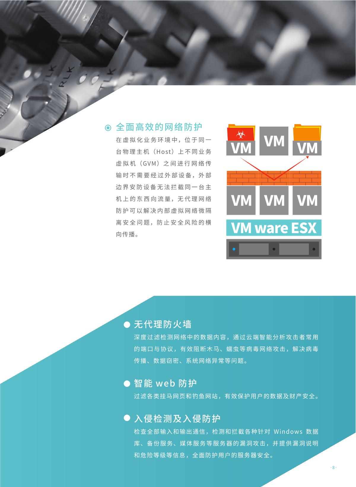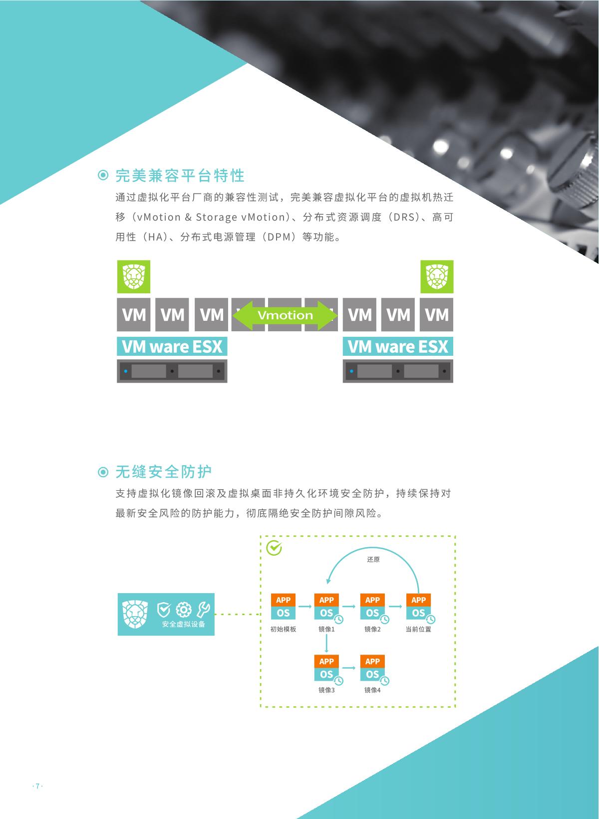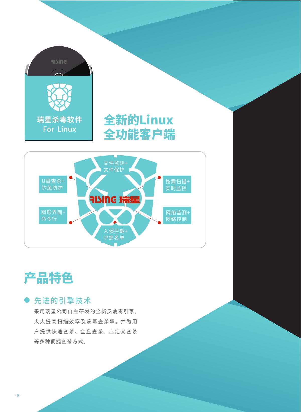 瑞星虚拟化恶意代码防护系统是瑞星公司推出的 国内首家企业级虛拟化平台安全防护综合解決方 案。该产品采用无代理 !有代理混合模式,具有 系统资源消耗低、实时防护未启动虛拟机、安全 策略随虛拟机迁移灵活配置、避免安全风暴发生 等优势,可完美支持各类虛拟化平台,是各行业 虛拟化产品用户推行安全防护解决方案的首选。 同时,统管平台架构下可以同时管理物理环境上 的终勞安全防护软件,实现一体化统一管控,便 于管理员对整体环境内安全风险的评估与安全问 题的处理。